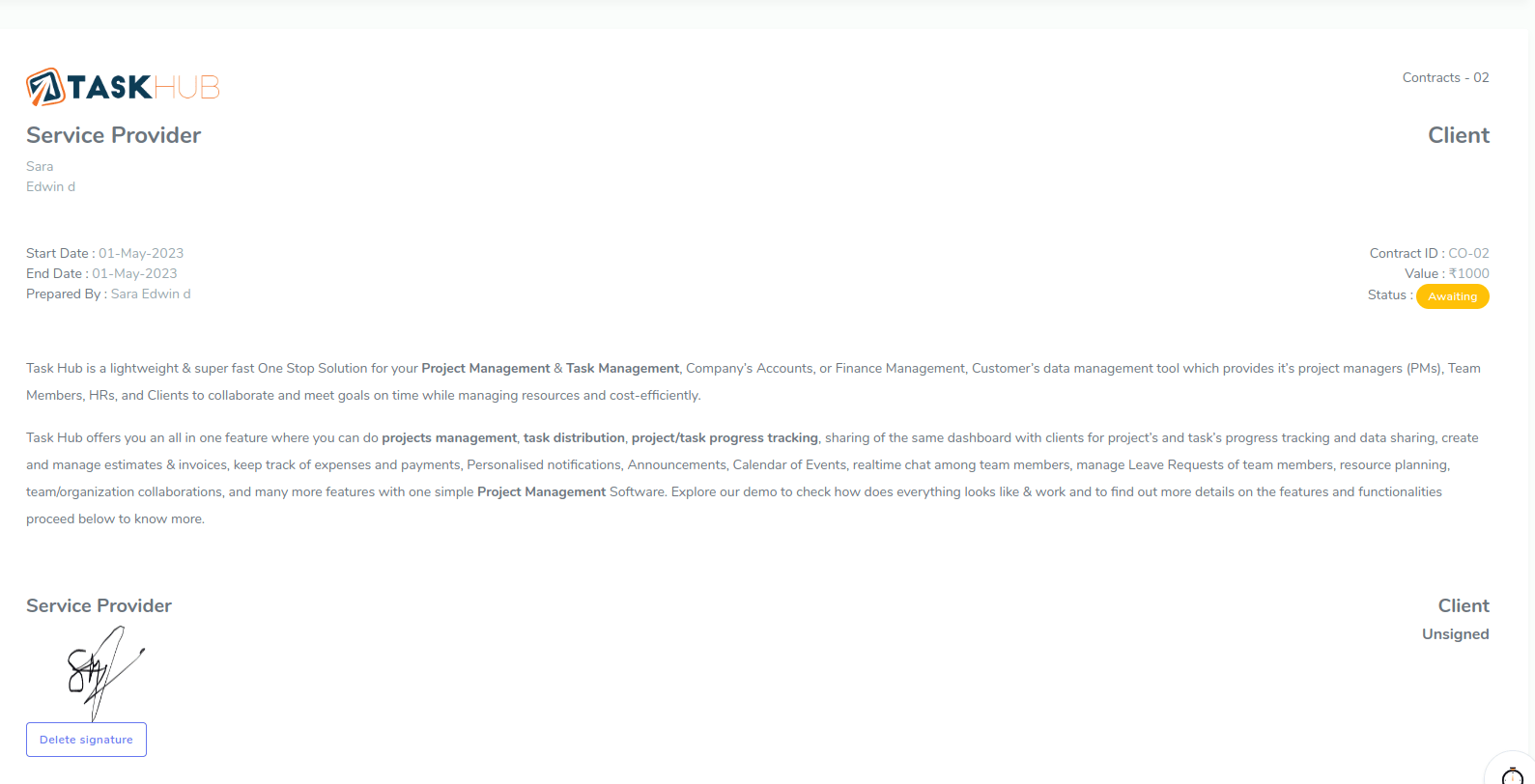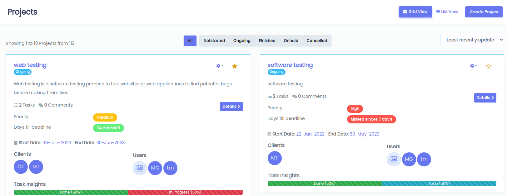 It provides basic information about task also you can filter tasks by project, status, due date, clients and users. you can see detailed information of particular task by clicking view button.